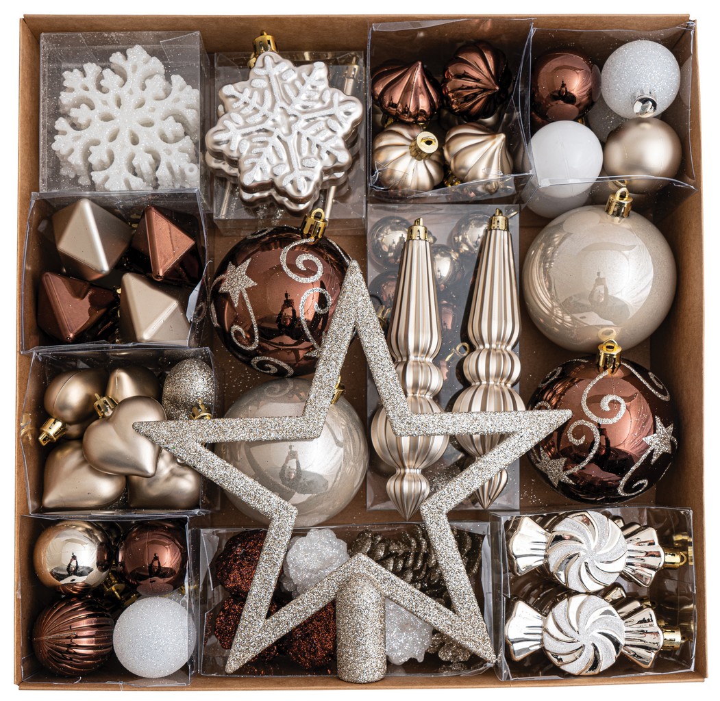 Σέτ 98 Τεμαχίων , Καφέ , Λευκά , Σαμπανί Διακοσμητικά Στολίδια 3-12cm Και Κορυφή 20cm