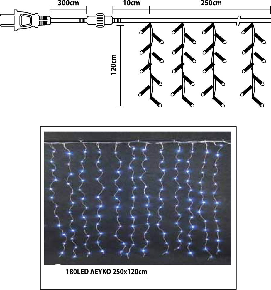 Χαρακτηριστικα: Μηκος: 250 cm Υψος: 120 cm Λαμπακια: 180 Led Χρωμα Καλωδιου: Ασημί Χρωμα Φωτισμου: Ψυχρο (Λευκο Του Παγου) Επεκτεινομενο: Οχι Προγραμμα: Οχι IP: 44 Λαμπακι Παχους: 3mm Kelvin: 6.000 – 10.000