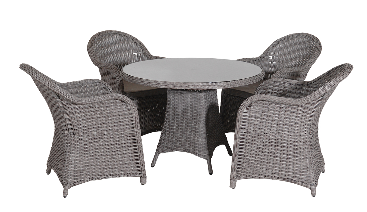 Περιλαμβάνονται: 1 Στρογγυλό Τραπέζι Διαστάσεις: 108 x 77(H)cm 4 Πολυθρόνες Διαστάσεις: 58(W) x 77(D) x 87(H)cm * Στην Τιμή Περιλαμβάνονται Και Τα Μαξιλάρια