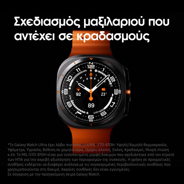Το Galaxy Watch Ultra αντέχει σε θερμοκρασίες που κυμαίνονται από -20℃ έως 50℃, είναι ανθεκτικό στο νερό, προσαρμόζεται τόσο σε σκοτεινά όσο και σε ηλιόλουστα περιβάλλοντα και βοηθά στη χάραξη της διαδρομής σου , με διπλό σύστημα GPS για μεγαλύτερη ακρίβεια.